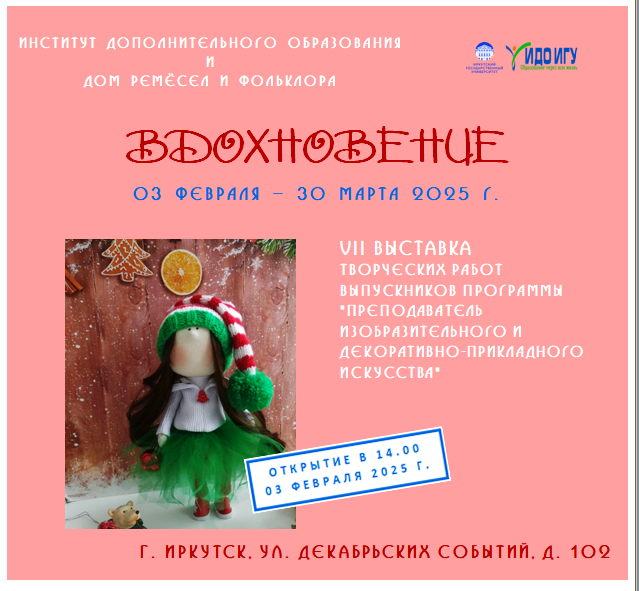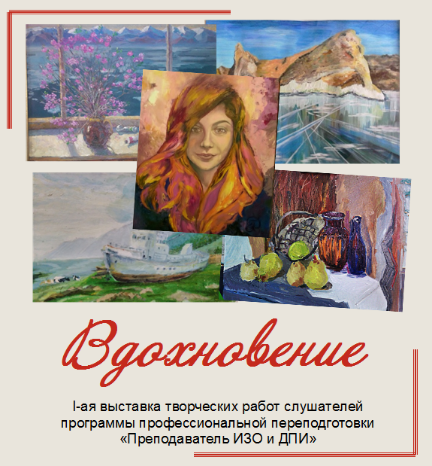ВДОХНОВЕНИЕ. VII ВЫСТАВКА ТВОРЧЕСКИХ РАБОТ СЛУШАТЕЛЕЙ ПРОГРАММЫ ПРОФЕССИОНАЛЬНОЙ ПЕРЕПОДГОТОВКИ "ПРЕПОДАВАТЕЛЬ ИЗО И ДПИ",